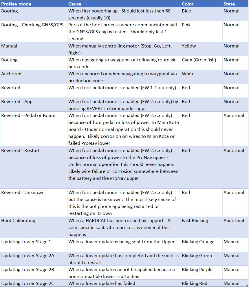 March 12, 2026 What do the LED colors on the upper GPS unit mean? What modes can the GPS be in? Here is the LED mapping guide for the ProNav upper unit: